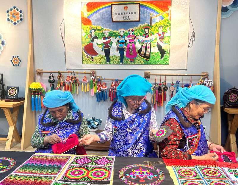 这几年,除了自己做盘绣,张卓麻什姐还引导村里的女孩子们学习土族盘绣。这名从小跟着奶奶和妈妈学盘绣手艺的本地村民说,“我是非遗传承人,就要想办法把这门技艺传承下去,带动身边更多的村民过上富足生活。”