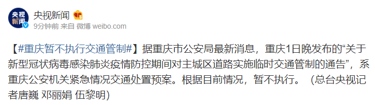 据重庆市公安局最新消息,重庆1日晚发布的“关于新型冠状病毒感染肺炎疫情防控期间对主城区道路实施临时交通管制的通告”,系重庆公安机关紧急情况交通处置预案。根据目前情况,暂不执行。(总台央视记者唐巍 邓丽娟 伍黎明)