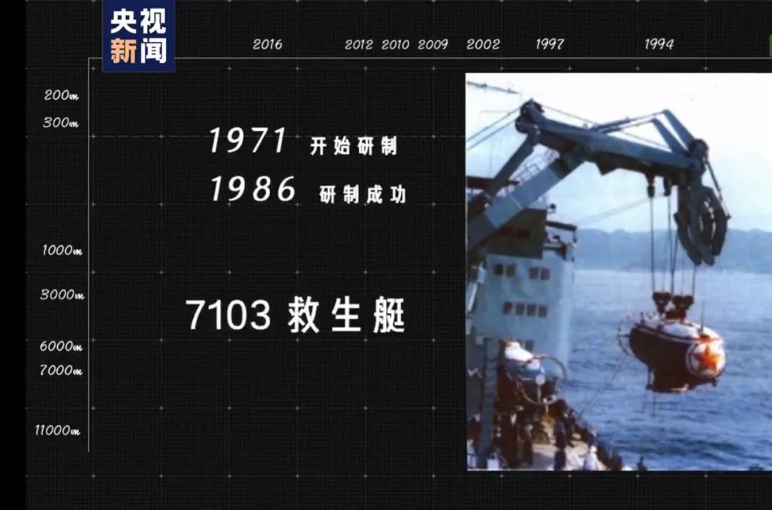 中国第一艘载人潜水器——7103救生艇 研制成功。虽然它只能下潜300米,航速也只有四节,但也是那个年代最先进的救援型载人潜水器。
