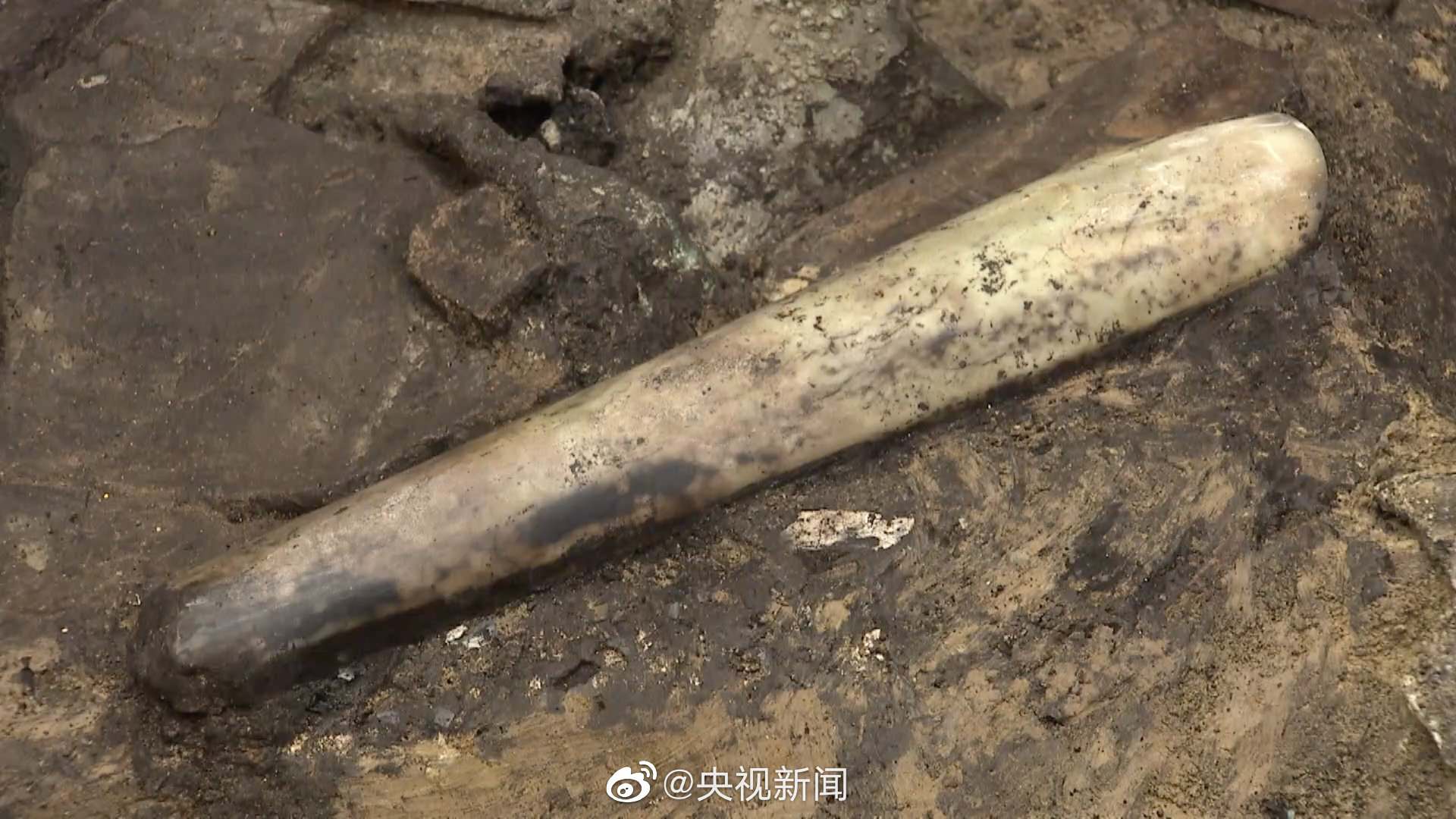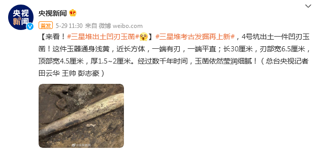 【来看!三星堆出土凹刃玉凿】三星堆考古发掘再上新,4号坑出土一件凹刃玉凿!这件玉器通身浅黄,近长方体,一端有刃,一端平直;长30厘米,刃部宽6.5厘米,顶部宽4.5厘米,厚1.5~2厘米。经过数千年时间,玉凿依然莹润细腻!(总台央视记者田云华 王帅 彭志豪)