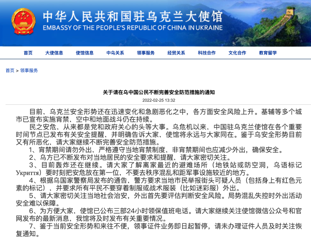 中国驻乌克兰大使馆:全力保护在乌中国公民安全