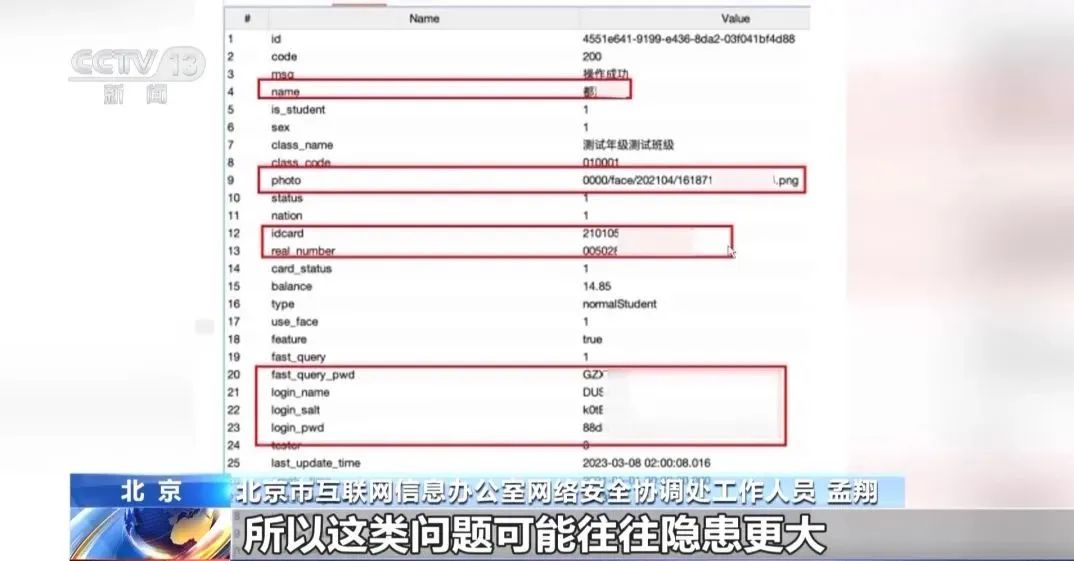 孟翔表示,北京市网信办在对某中学的智慧食堂小程序检测时发现,它实际依托于某第三方企业的智慧订餐系统平台开展服务。该平台服务范围广泛,利用该平台存在的技术漏洞,可以看到全国1369所学校,将近200万名学生的个人信息,包括师生的姓名、照片、身份证号。