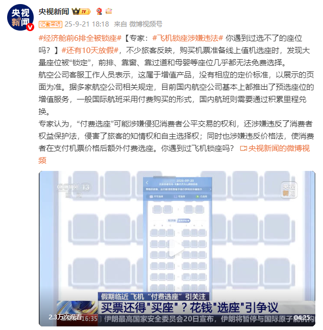 专家认为,“付费选座”可能涉嫌侵犯消费者公平交易的权利,还涉嫌违反了消费者权益保护法,侵害了旅客的知情权和自主选择权;同时也涉嫌违反价格法,使消费者在支付机票价格后额外付费选座。你遇到过飞机锁座吗?