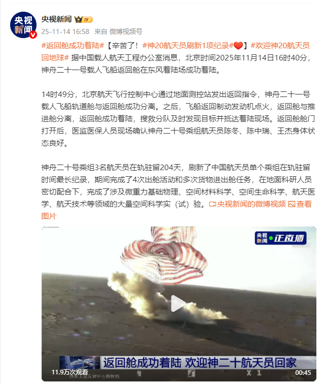 据中国载人航天工程办公室消息,北京时间2025年11月14日16时40分,神舟二十一号载人飞船返回舱在东风着陆场成功着陆。
