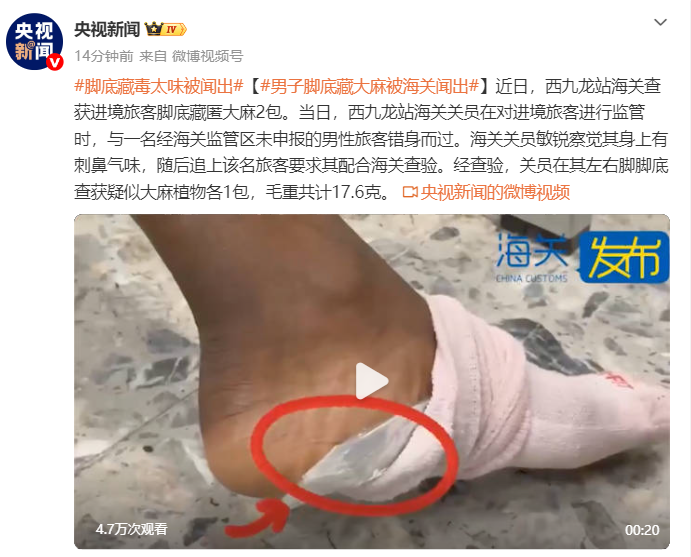 男子脚底藏大麻,海关关员敏锐察觉刺鼻气味