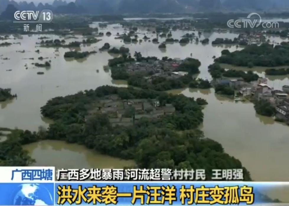 受连日强降雨影响,广西桂林、河池等多地遭受洪涝灾害,一些村庄、居民小区被洪水浸泡,多名群众被困。桂林市临桂区四塘镇,全镇大面积被洪水浸泡,3万多亩作物受灾,300多户村民家中进水,被困群众已经全部安全转移。从高空俯瞰,整个四塘镇一片汪洋,一些村庄成了孤岛。