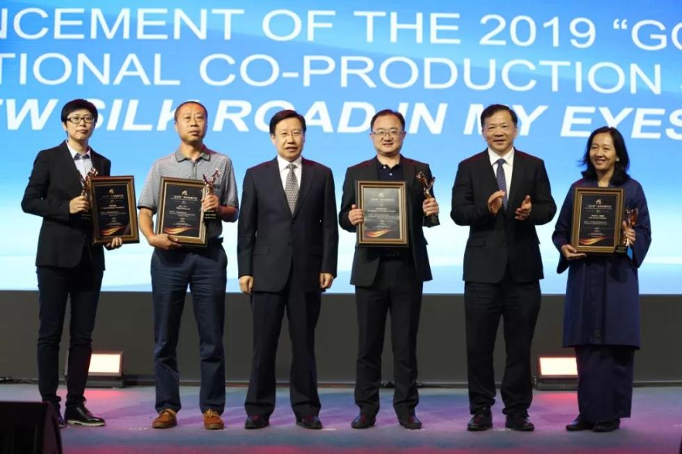 △中宣部常务副部长王晓晖,中宣部副部长、中央广播电视总台台长慎海雄为2019年“金丝带”多国合拍系列节目——《我看今日丝路》获评优秀作品颁发证书