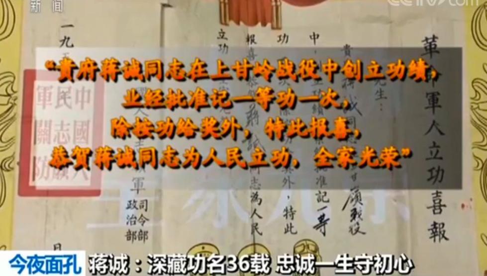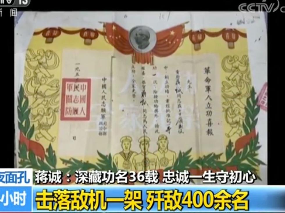 一九五三年,一封给蒋诚父亲的立功喜报从中国人民志愿军政治部、司令部寄出,上面写道 “一九五二年十一月于上甘岭战役中,配合反击坚守537.7高地的战斗里,该同志发挥了高度的英勇顽强精神,克服了重重困难,带领班里在严密敌炮占领下,熟练地掌握了技术,以重机枪歼敌400余名,击毁敌重机枪一挺,有力地压制了敌火力点,封锁了敌军运输道路,击落敌机一架,身负重伤还不下火线,配合步兵完成了任务,对战斗胜利起了重大作用。 ”