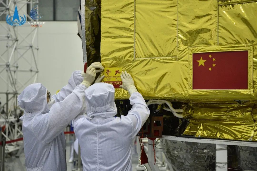 工作人员正在火星环绕器上安装会徽