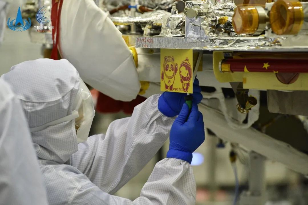 工作人员正在火星着陆器上安装吉祥物