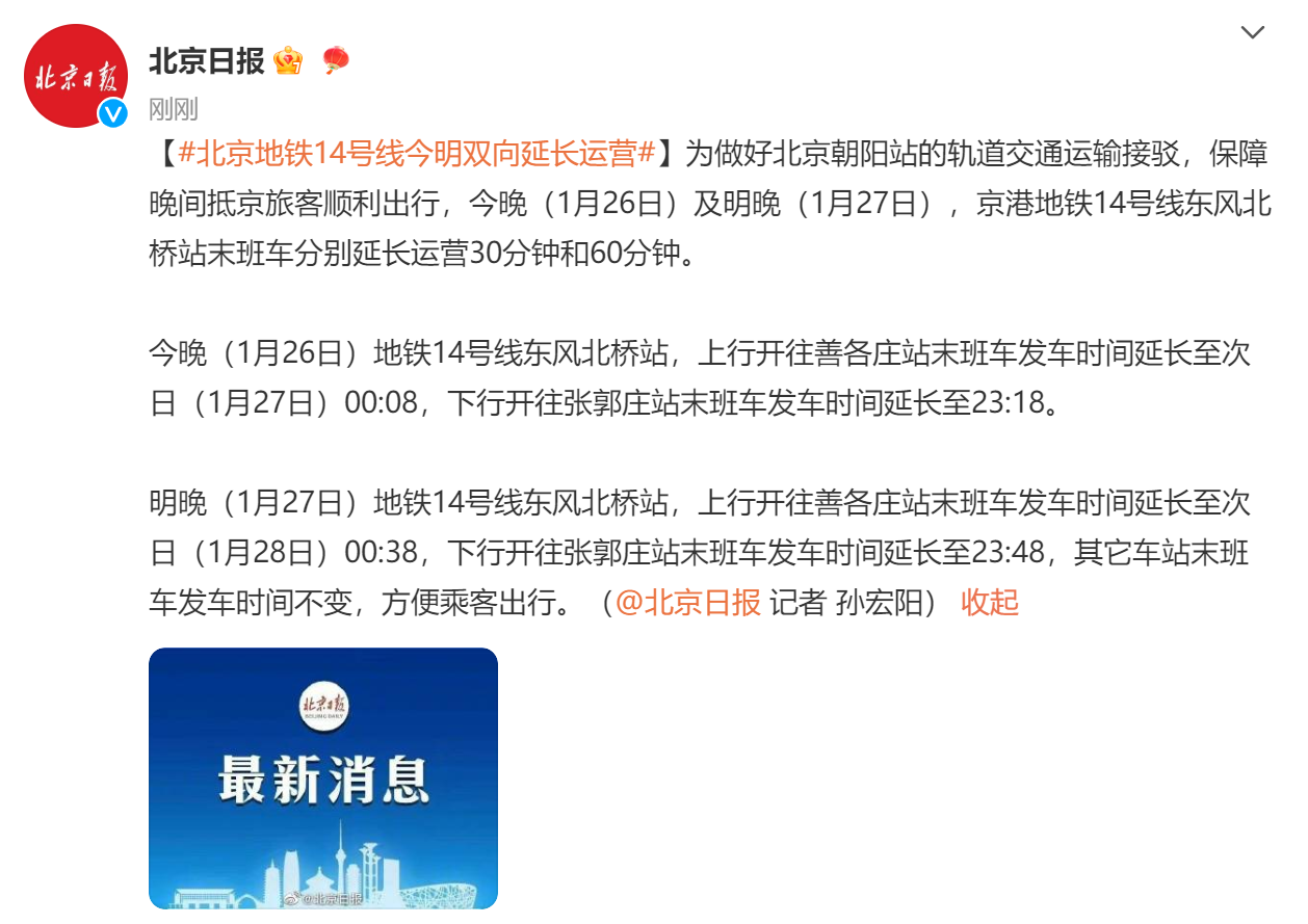 为做好北京朝阳站的轨道交通运输接驳,保障晚间抵京旅客顺利出行,今晚(1月26日)及明晚(1月27日),京港地铁14号线东风北桥站末班车分别延长运营30分钟和60分钟。