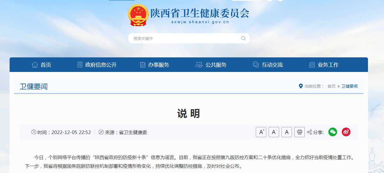 陕西卫健委:个别网络平台传播的“陕西省政府的防疫新十条”信息为谣言