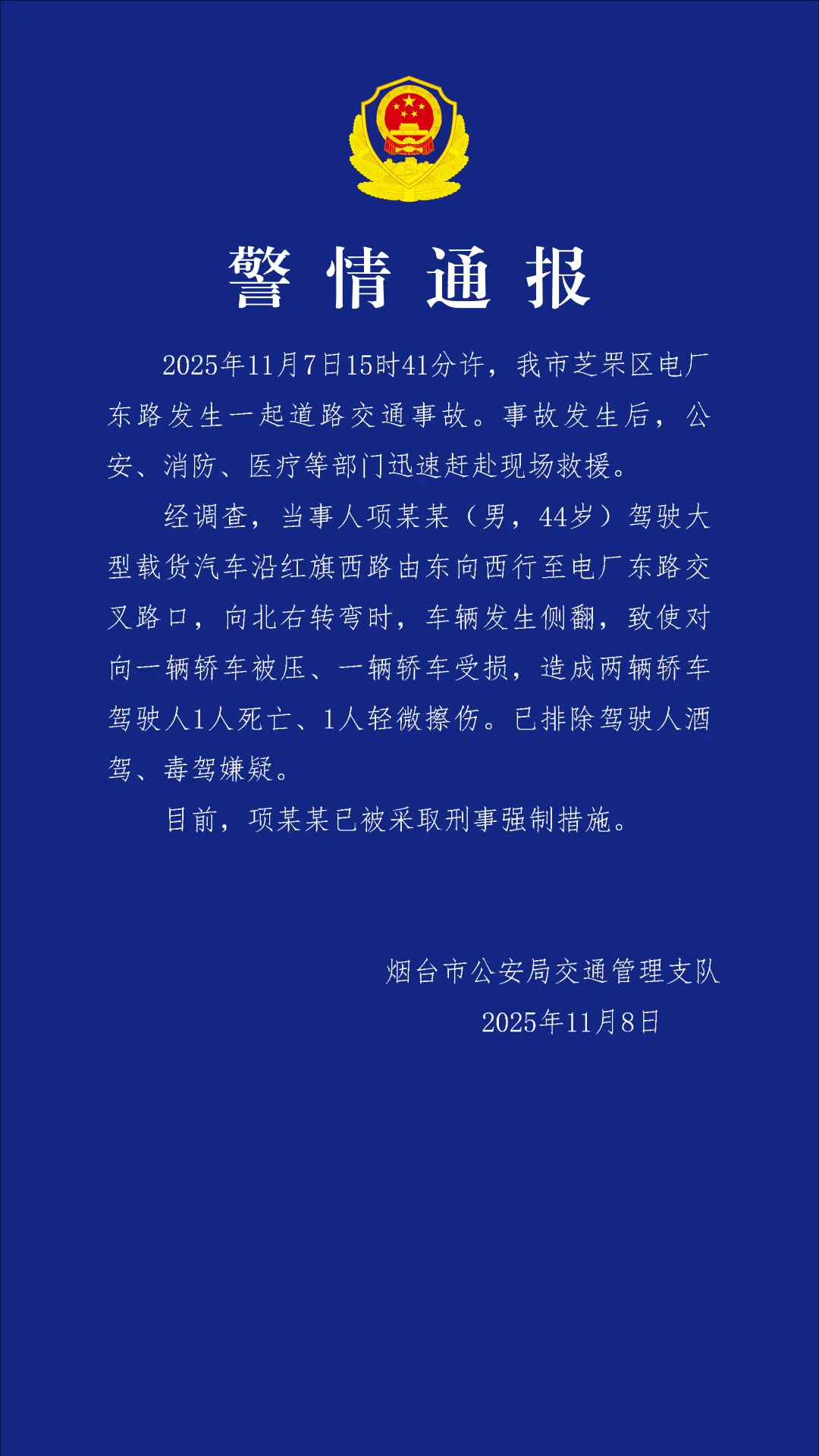 烟台交警:一大货车右转侧翻压损轿车,致1死1擦伤,驾驶人已被采取刑事强制措施