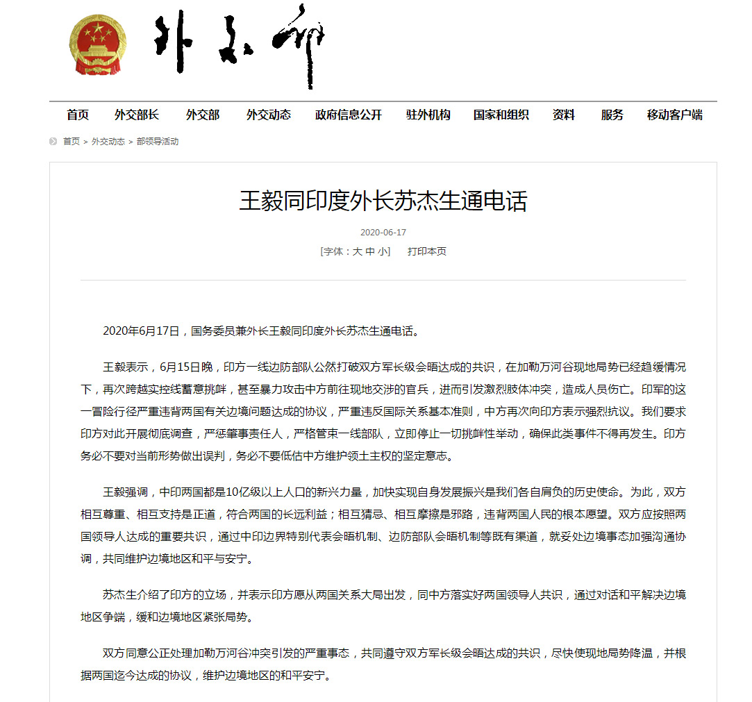 2020年6月17日,国务委员兼外长王毅同印度外长苏杰生通电话。