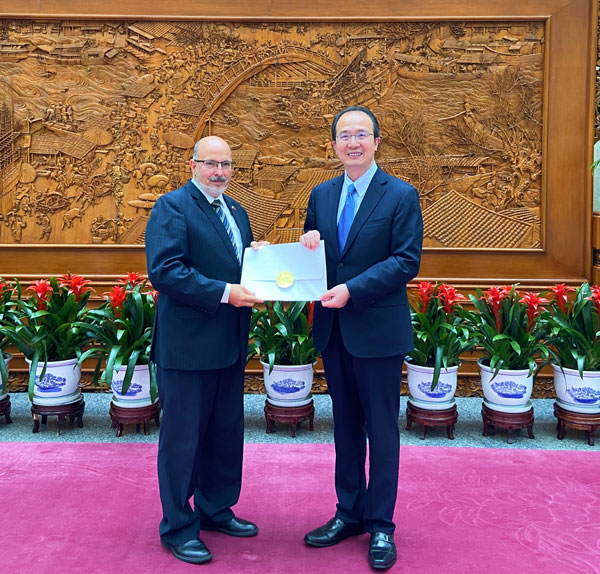外交部礼宾司司长洪磊接受古巴新任驻华大使白诗德递交国书副本