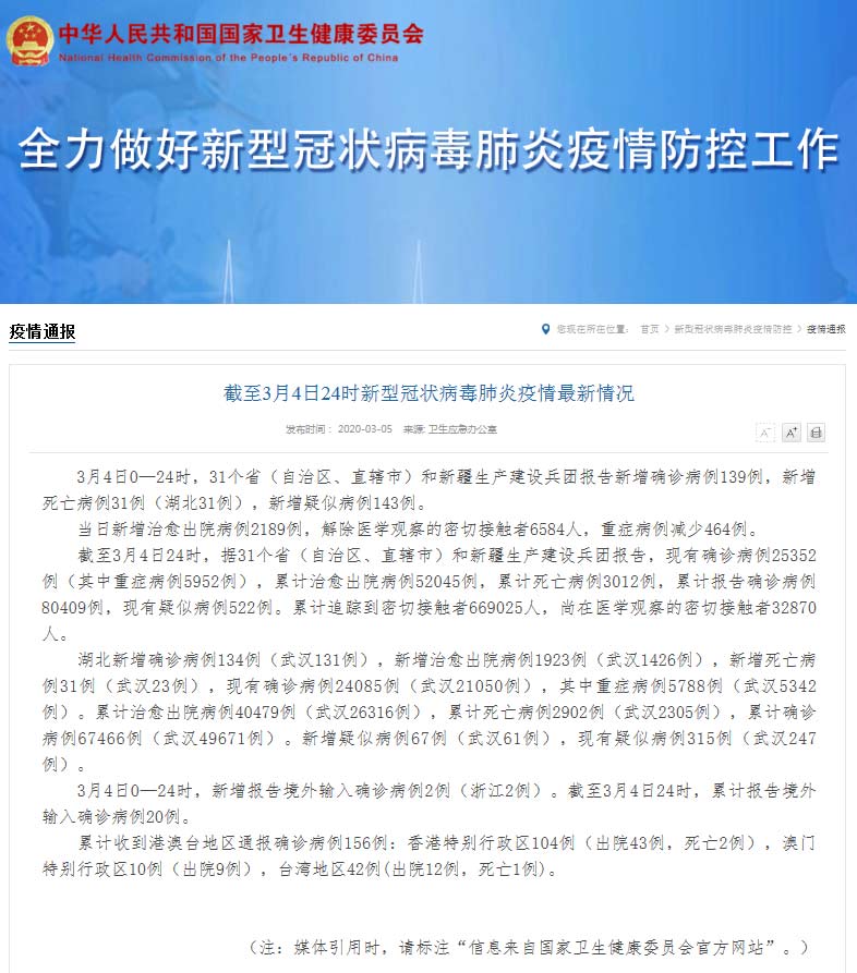 截至3月4日24时,据31个省(自治区、直辖市)和新疆生产建设兵团报告,现有确诊病例25352例(其中重症病例5952例),累计治愈出院病例52045例,累计死亡病例3012例,累计报告确诊病例80409例,现有疑似病例522例。累计追踪到密切接触者669025人,尚在医学观察的密切接触者32870人。