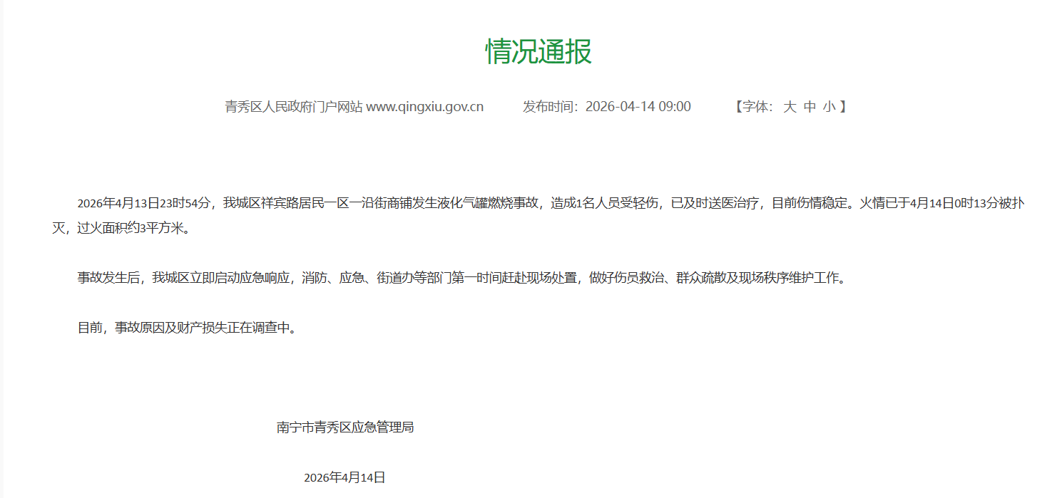 2026年4月13日23时54分,我城区祥宾路居民一区一沿街商铺发生液化气罐燃烧事故,造成1名人员受轻伤,已及时送医治疗,目前伤情稳定。火情已于4月14日0时13分被扑灭,过火面积约3平方米。