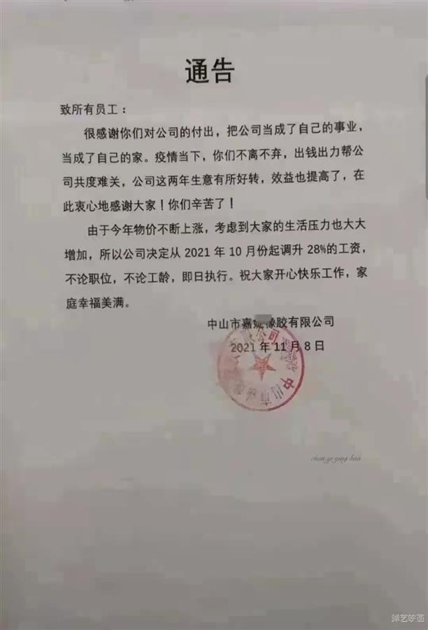 通告还称,由于今年物价上涨,考虑到大家的生活压力也大大增加,所以公司决定从2021年10月份起调升28%的工资,不论职位,不论工龄,即日执行。