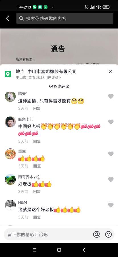该公司负责人还在短视频平台发布了这则通告,获得超十万网友点赞。有网友表示,相当不错的企业,知恩感恩,这样的企业不发达才怪。还有网友直接表示想到该公司工作。更多的网友则表示,这样的老板必须点赞!