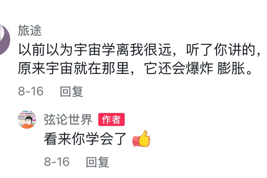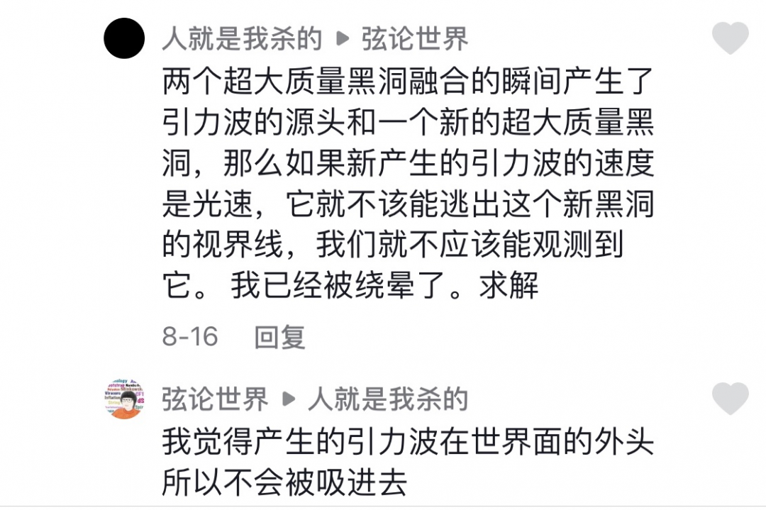 视频发布后,很快引起网友关注。有网友留言说:“美女报道了9亿年前的新闻。”“听不懂但大受震撼。”“我一个高中文凭竟然关注了你。”还有网友与她讨论:“中子星会不会继续坍塌成黑洞?”