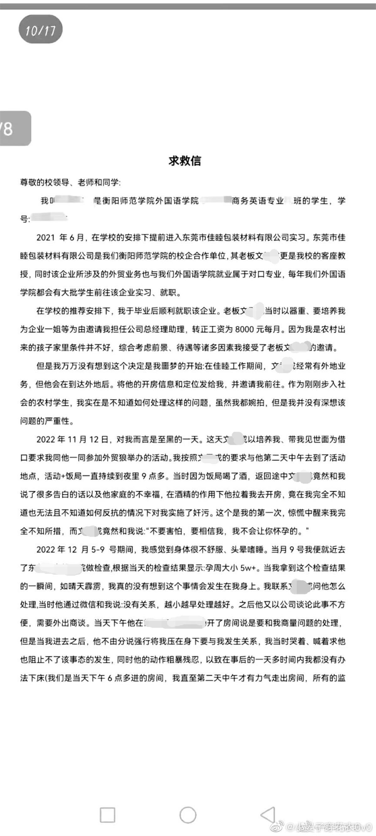 网友发布的文章显示,她本人是衡阳师范学院外国语学院商务英语专业的学生,2021年6月,她在学校安排下进入东莞市佳睦包装材料有限公司实习。该公司是衡阳师范学院的校企合作单位,老板文某某是学校的客座教授。同时,该企业所涉及的外贸业务也与外国语学院就业属于对口专业,每年外国语学院都会有学生前往该企业实习。毕业后,她顺利就职于该企业。老板文某某当时邀请她担任公司总经理助理,转正后工资为8000元每月。因为她是农村出来的孩子,家里条件并不好,综合考虑前景、待遇等诸多因素,她接受了邀请。