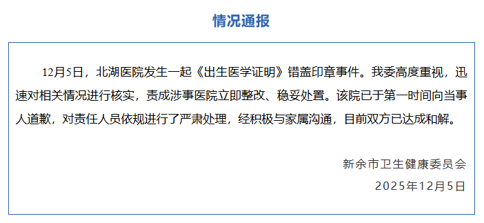 12月5日,北湖医院发生一起《出生医学证明》错盖印章事件。我委高度重视,迅速对相关情况进行核实,责成涉事医院立即整改、稳妥处置。该院已于第一时间向当事人道歉,对责任人员依规进行了严肃处理,经积极与家属沟通,目前双方已达成和解。