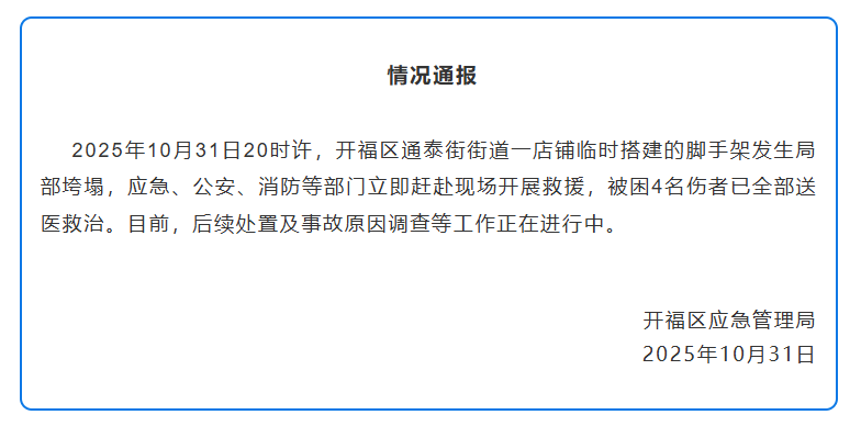 2025年10月31日20时许,开福区通泰街街道一店铺临时搭建的脚手架发生局部垮塌,应急、公安、消防等部门立即赶赴现场开展救援,被困4名伤者已全部送医救治。目前,后续处置及事故原因调查等工作正在进行中。