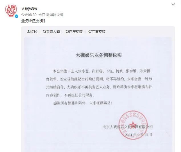 公司旗下艺人张小斐、许君聪、卜钰、何欢、张泰维、朱天福、曹贺军、刘宏禄的经纪合约已到期,将不再续约,未来会换一种形式继续合作。