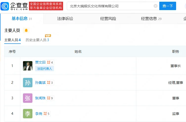 目前,贾玲共有6家控制企业,其中仅北京大碗娱乐文化传媒有限公司、喀什大碗娱乐文化传媒有限公司为存续状态。