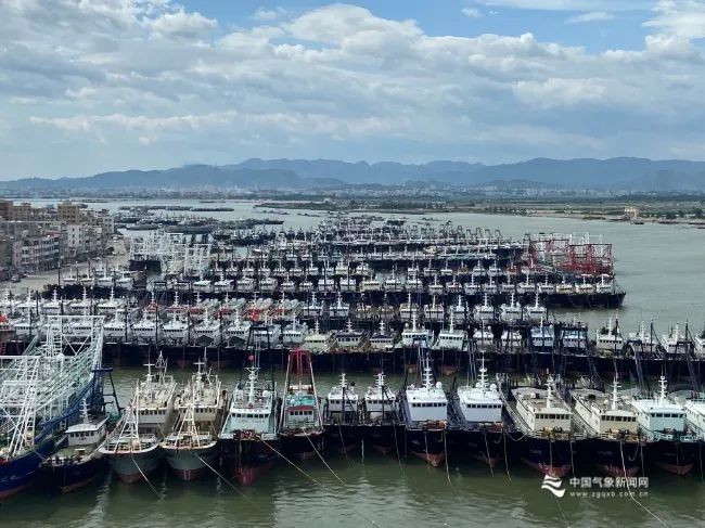 图为7月1日,茂名市电白博贺港渔船收到台风预警信息后,加强在港渔船的安全防范,有序在港避风。