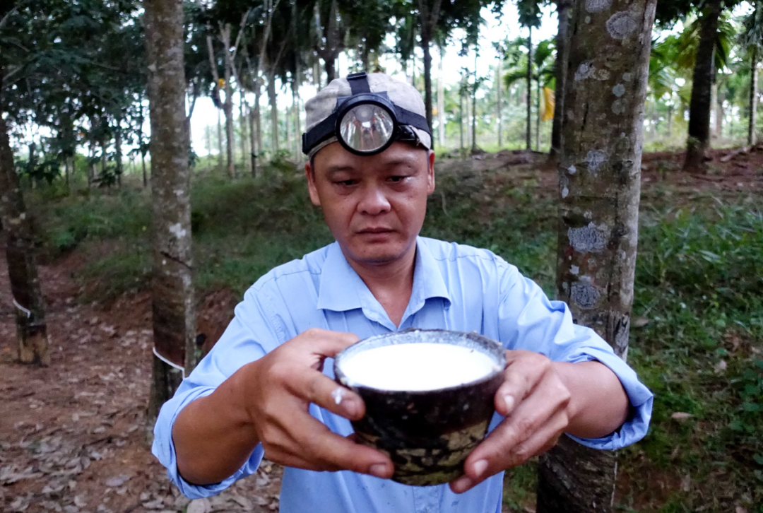 胶工雷金翔在胶地里展示橡胶胶水,6两1杯的胶水只能卖0.75元,甚至买不到1瓶水。新华社记者赵颖全摄