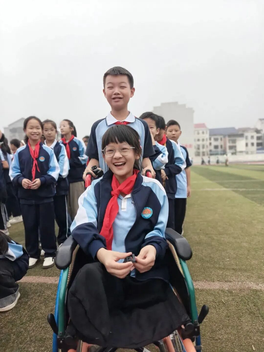 同学们也主动帮忙拿轮椅