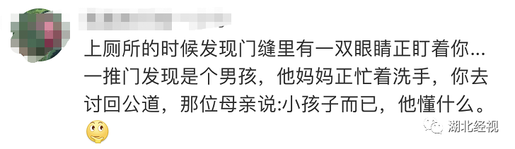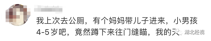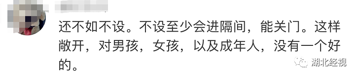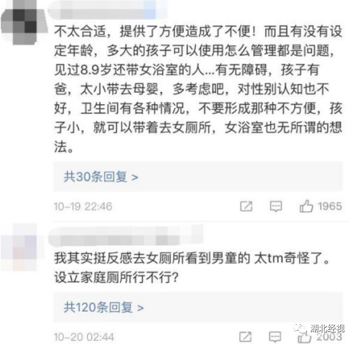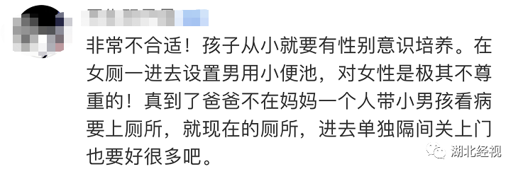 “女厕所就是女性上的厕所,凭什么要进男的?”“绝不可理解,男性为什么可以出现在女厕所?”“很尴尬,男的任何年龄都不可以进女厕所。”“我真的蛮讨厌带小男孩一起进女厕所的。”一些网友评论说,妈妈带男童进女厕的做法不合理,不管孩子多大,都要有性别意识,这很重要。一位网友评论说:“不说什么小女孩看到怎么样,我一个成年女性进厕所看到也觉得辣眼睛。”