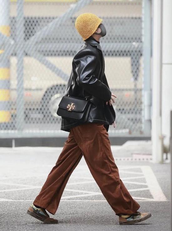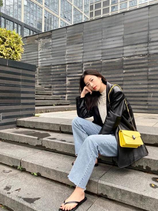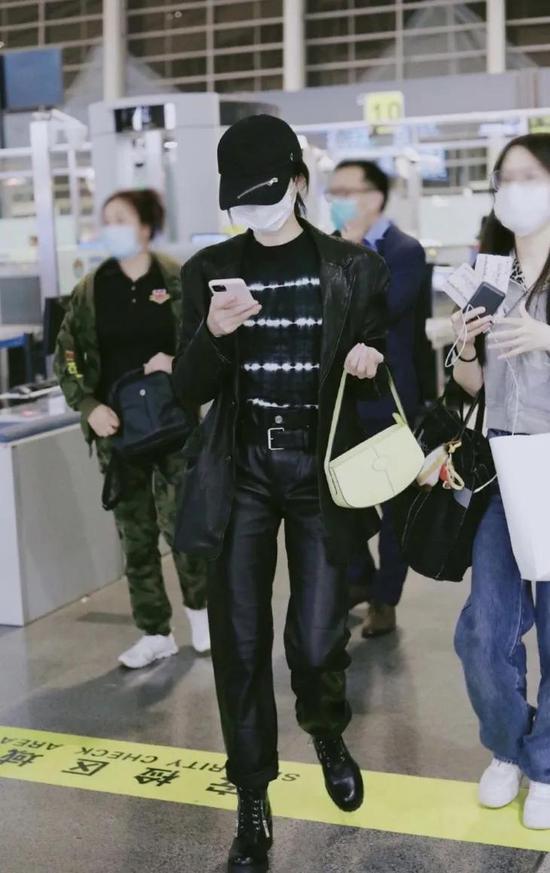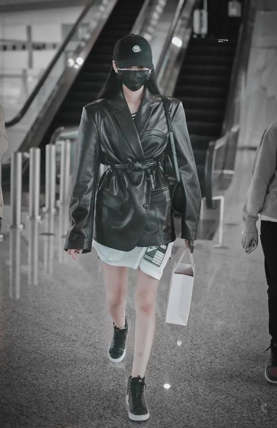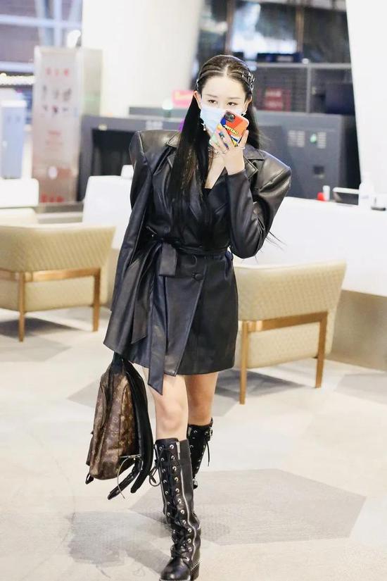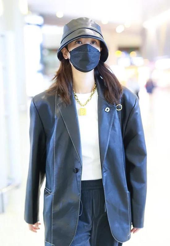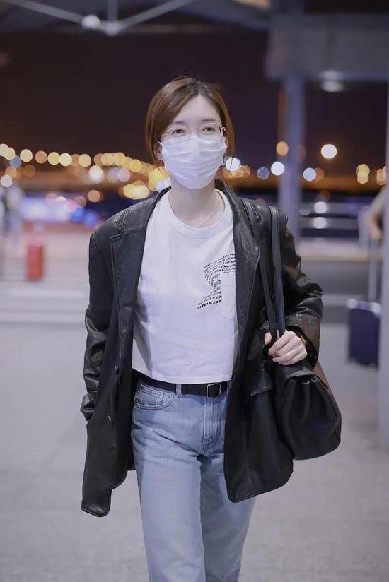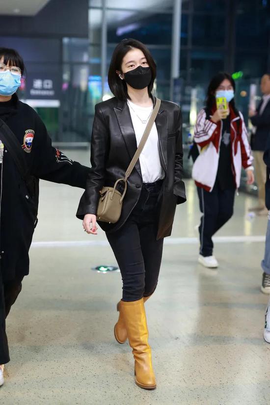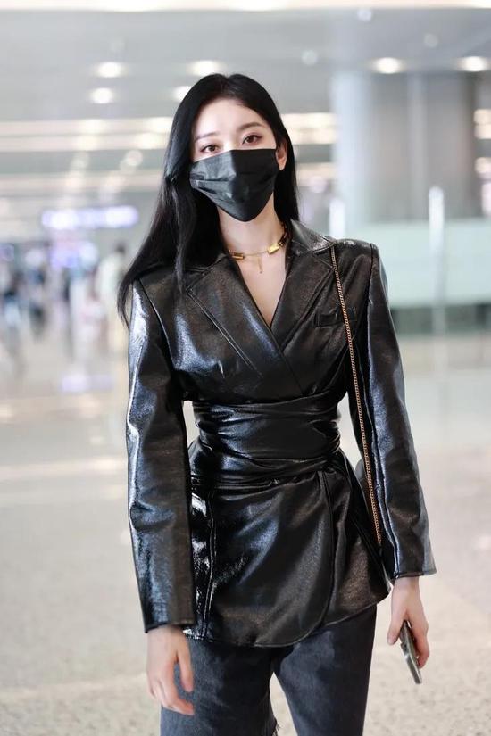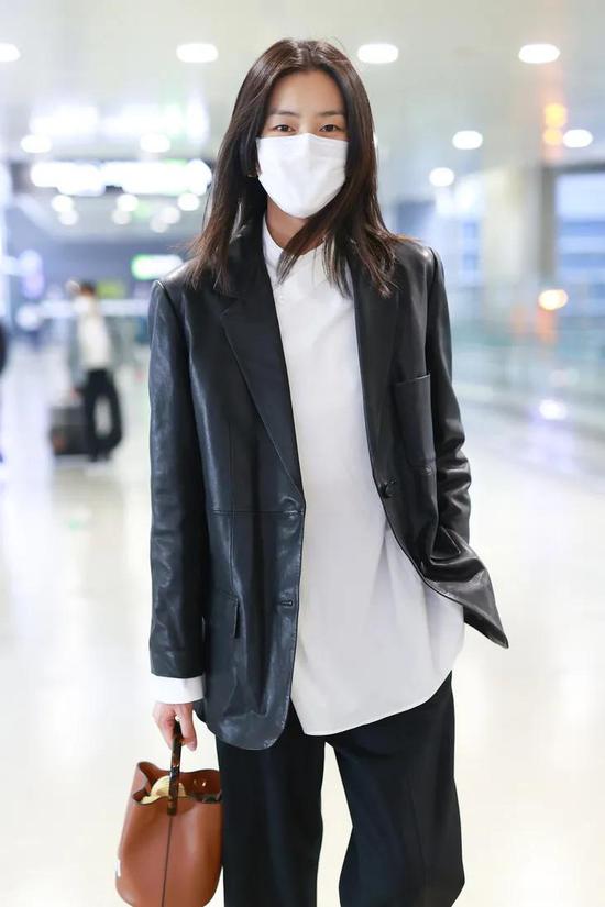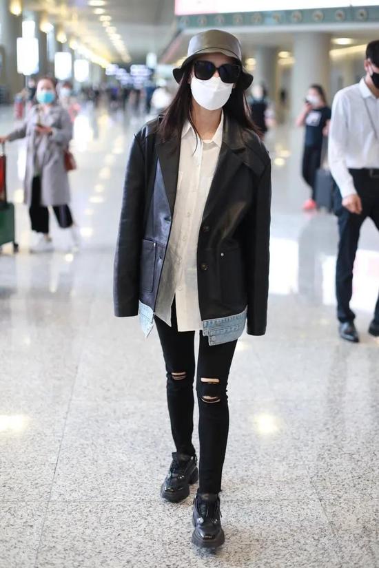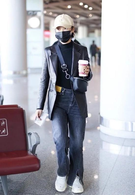 江疏影示范,黑色皮质西服搭配一条浅色牛仔裤,行走在机场悠闲舒服,也能帅气十足。
