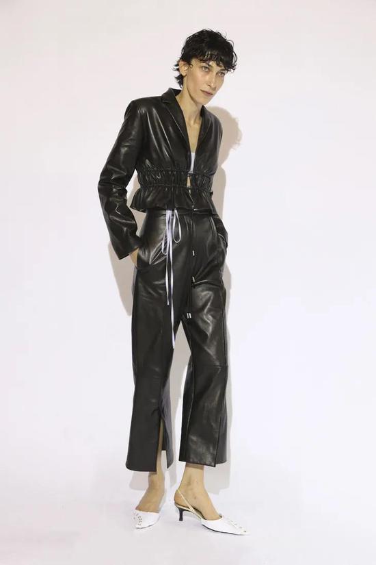 小众品牌的设计不落人后,短西服、长西服;绑带装饰、收腰设计……同样的黑色皮西服却能呈现出风格迥异的态度。