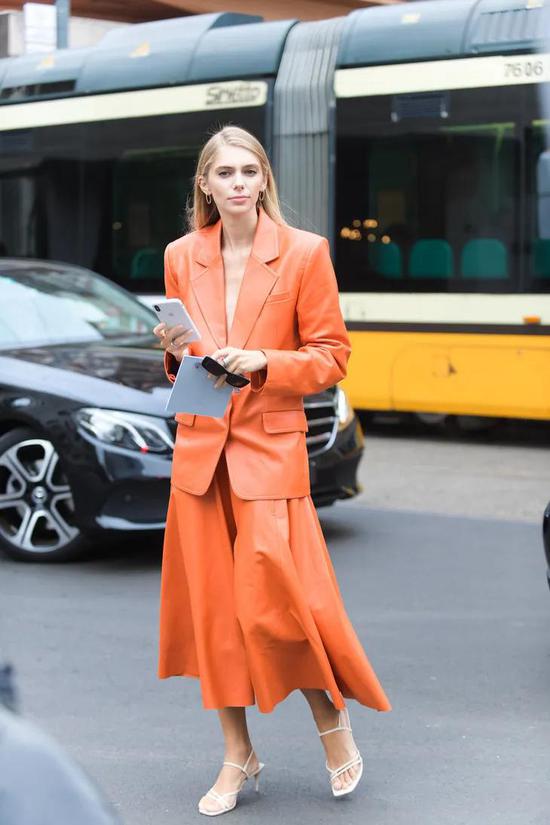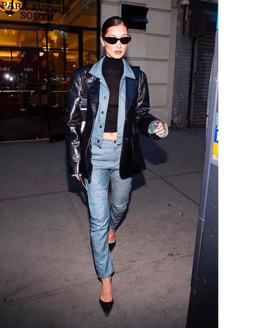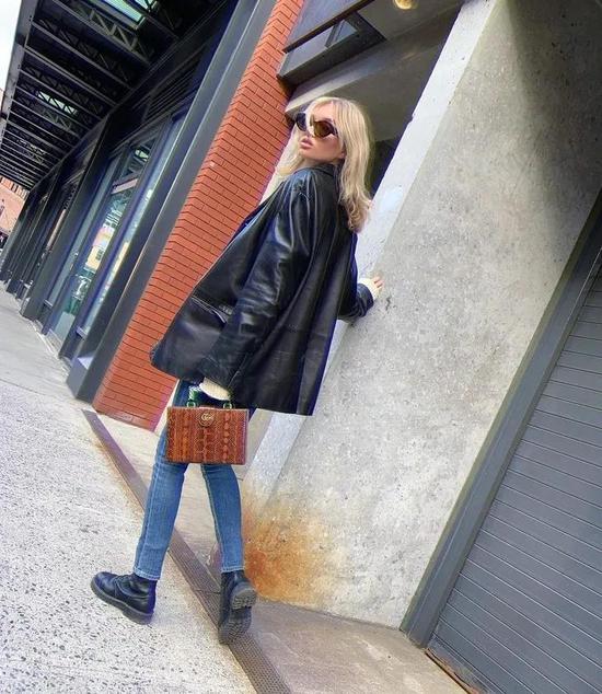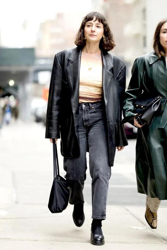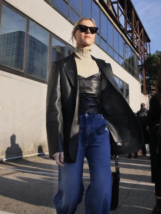 选择直筒牛仔裤来和黑色皮西服组CP是时尚圈的惯用伎俩,亮色可以中和掉深色皮衣的造型沉闷感,行走起来流露出张扬和不羁。