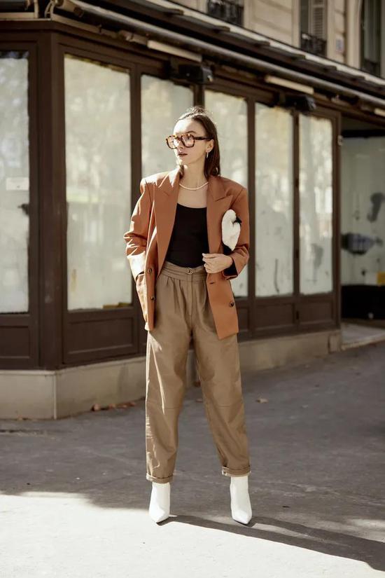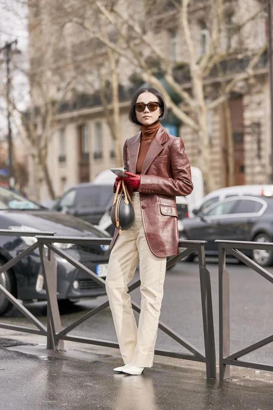 皮西服之所以在秋冬季节备受青睐,还因为它驾驭各种风格毫无压力。大廓形随意搭配各种内搭,垫肩效果复古感爆棚。