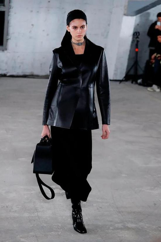 也难怪皮西服在秀场一直备受设计师的青睐。这两年,街头风的流行促进皮西服的热风吹得愈加“猛烈”——大火的街头新秀1017 ALYX结合自己拿手的机能风与独特的暗黑手法,塑造出裁剪合身又充满机械感的皮西服。