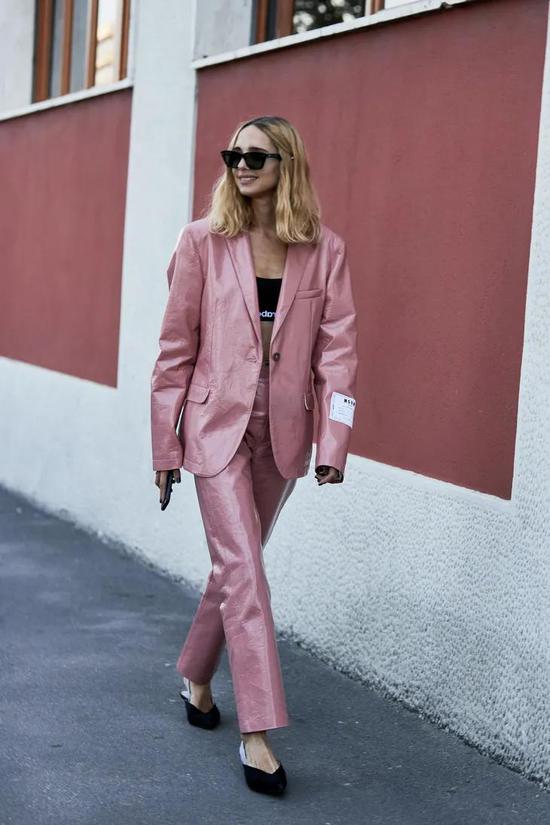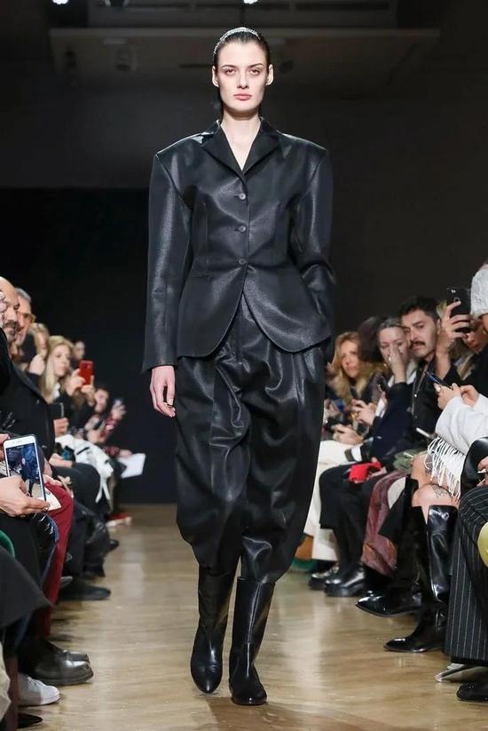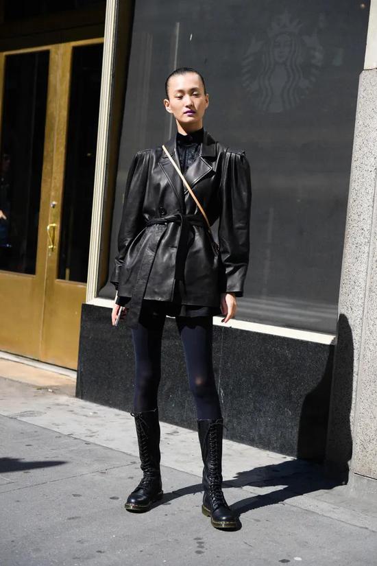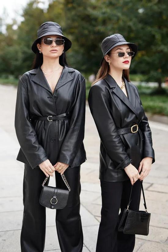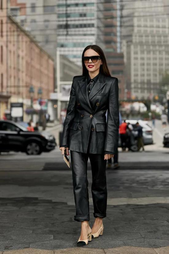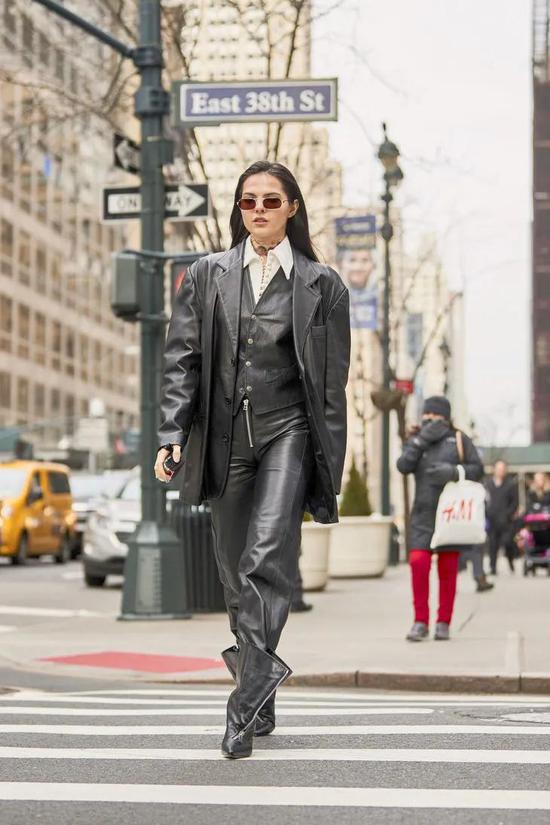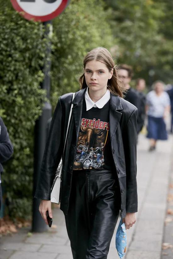 无论是秀场还是时尚明星,都喜欢用黑色皮衣来凹造型,不同的搭配也赋予了皮西服的万能属性。