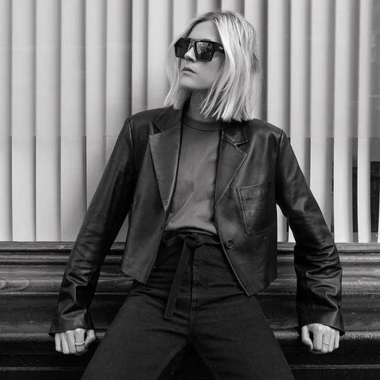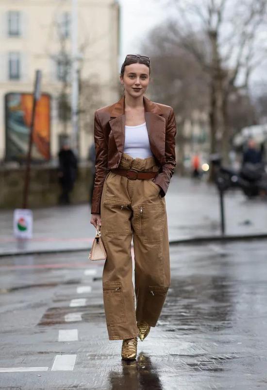 同样很俏皮的还有短款皮西服,完全中和掉皮质面料的硬朗,凸显女性气场的同时,拉长腿型于无形。