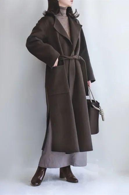 咖色高领针织毛衣搭配深咖色过膝长大衣,如此搭配又形成了深浅色对比,看着分外高级!