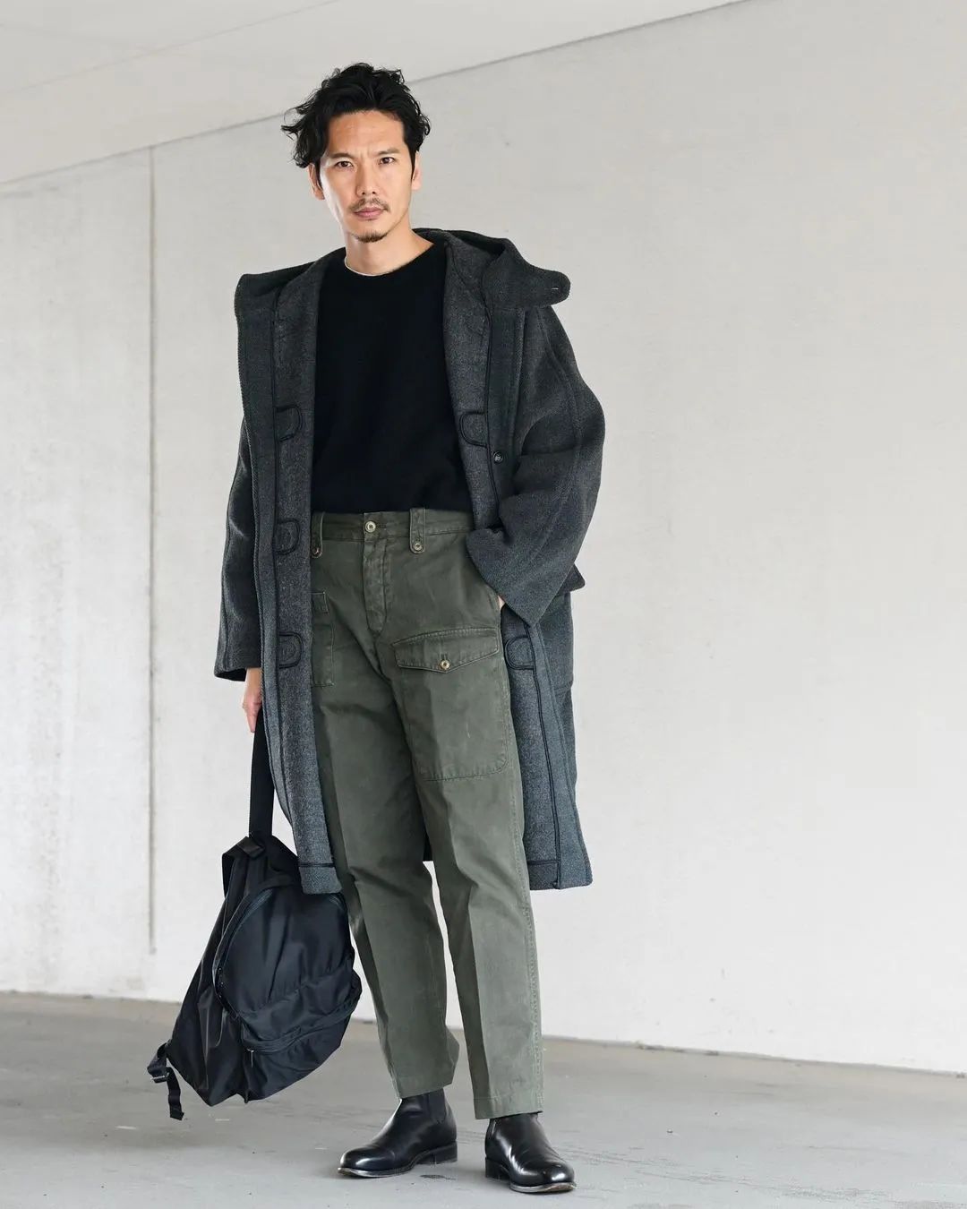 除此之外,往往被认为带有稚气感的牛角扣大衣,在他的手下却凭借硬朗的军裤和切尔西靴将它拉回到成熟的造型调性中,氛围休闲但不会产生半点幼稚的印象。