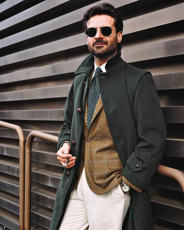 墨绿色花呢大衣与泥土色 Sport coat 的大自然配色组合,绝对是易出彩而不会出错的选择;清爽的白裤子以及波点领带恰好完成了层次之间的过渡与呼应,避免了元素过于杂乱。