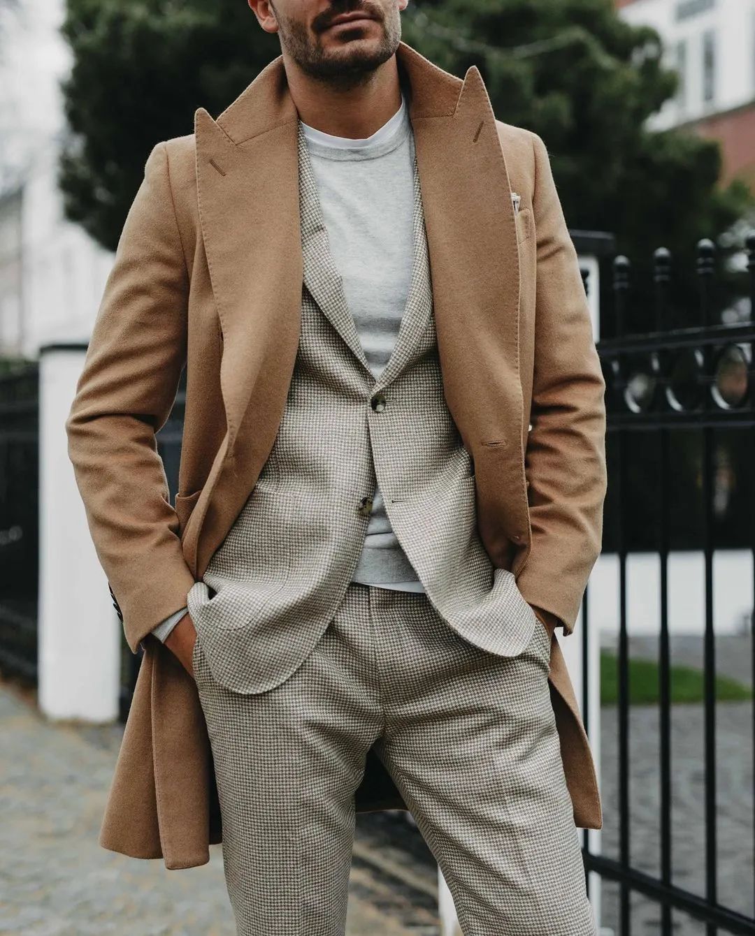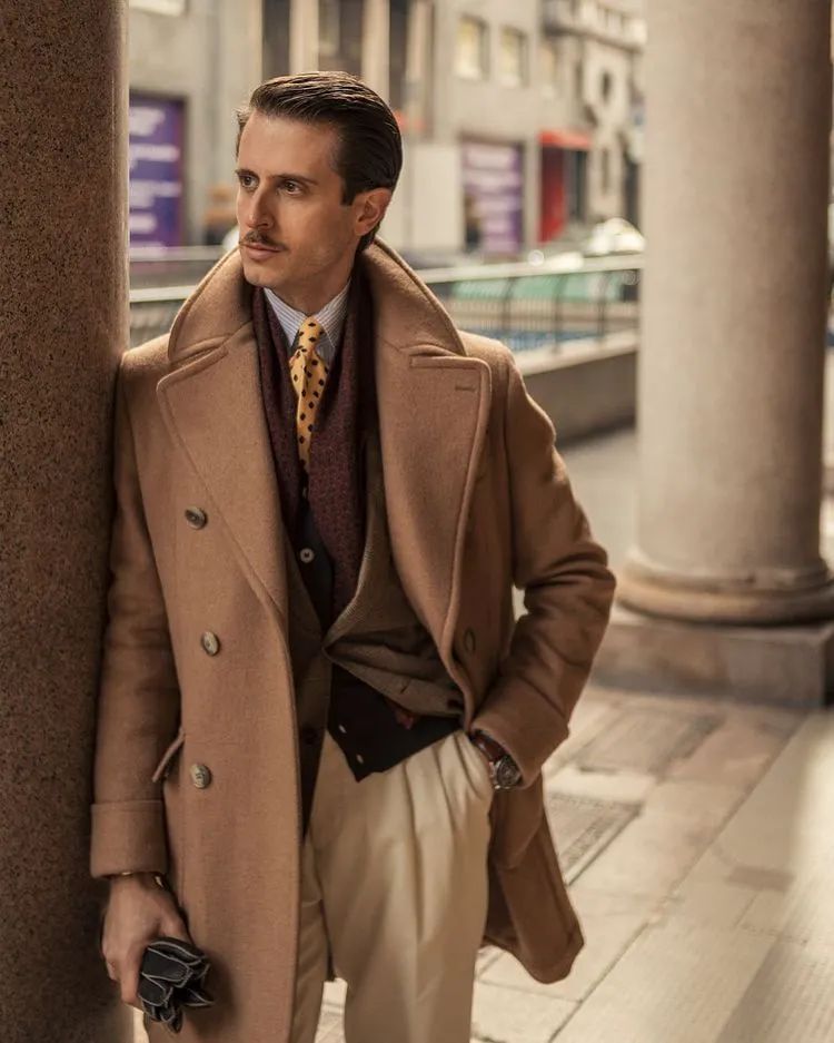 相较之下,这套稍浅的大地色系搭配似乎更容易驾驭,驼色 Ulster coat + 奶油白裤子的典型上深下浅度假风,比第一张的乡村风格更加轻松优雅;加上领带的波点图案,亮点呼之欲出。