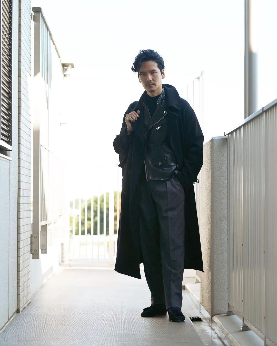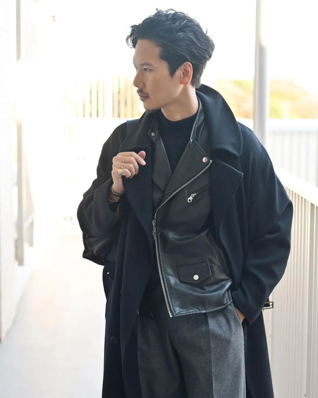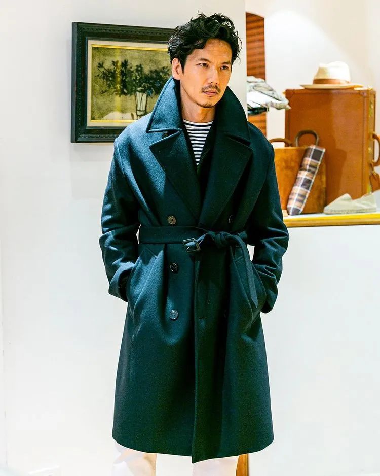 不过说到西口修平又怎么会忽略他那最擅长的混搭技法呢,像下图他就把 Biker Jacket 这种明显与双排扣大衣质感、取向不同的皮夹克作为内搭。