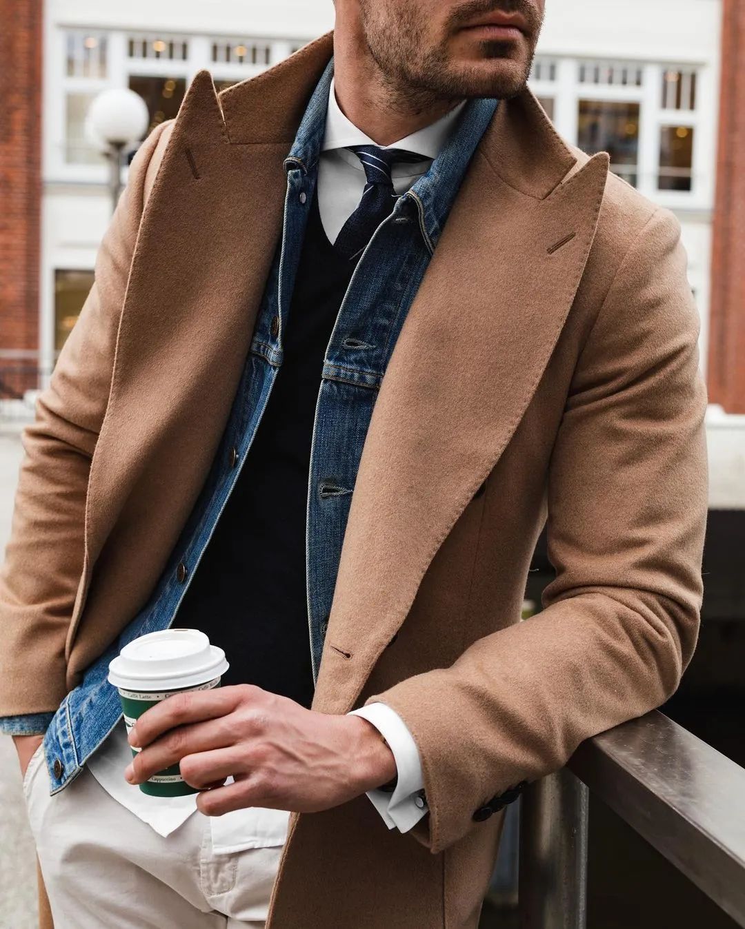 这身驼色马球大衣的穿搭,可以说是教科书式的美式休闲风格了,当然最好把领带摘掉,驼色大衣+黑色毛衣+白色单裤的搭配的确效果足够能打,但在中层加入一抹丹宁色调后,造型的质感立马饱满了许多。