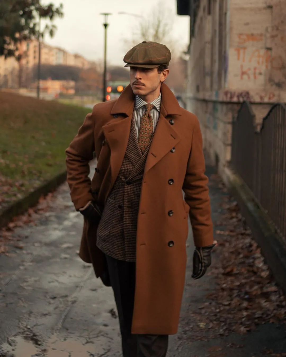 不过话说回来,这身造型的复古氛围之所以如此到位,绝对少不了报童帽的功劳。当这顶苔藓色的大格纹报童帽往 Marco 头上一戴,造型完成度瞬间得到提升。