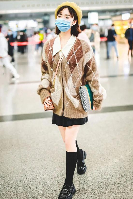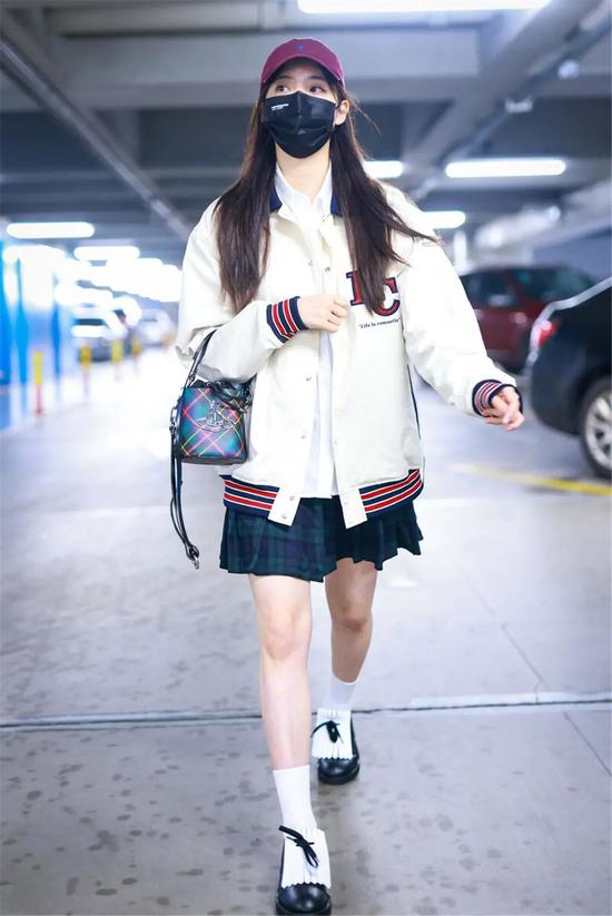 欧阳娜娜的机场照,棒球服+JK裙的组合,搭配了一双白色短袜,也是不错的选择。