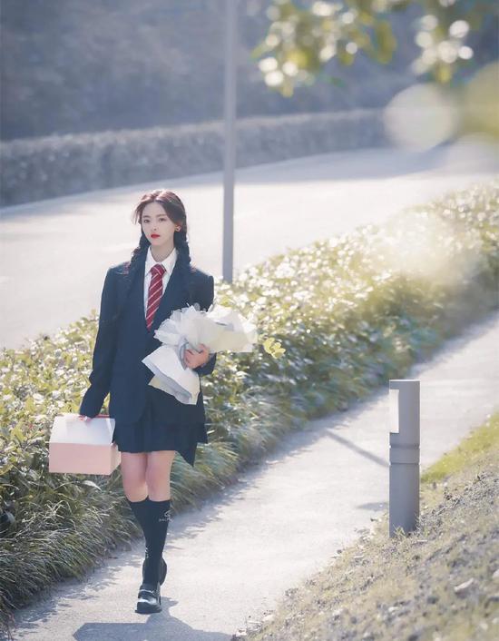 在《平行时空遇见你》中杨超越用JK裙搭配中筒袜,简直就是校花既视感!