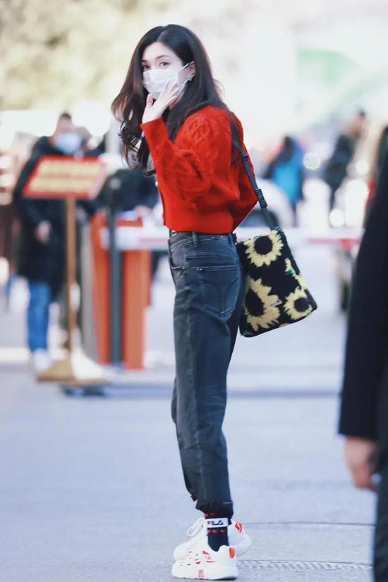 还有江疏影,匆匆赶路不忘秀时髦。红毛衣配黑色牛仔裤简单明了,仔细看她的袜子色彩跟着装也是格外协调呼应,巧妙的很呢!